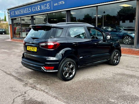 Ford Ecosport ST-LINE 1.0L (138 bhp), Year 2022 (22), Mileage 20,300 miles, Manual transmission, Petrol fuel type, Insurance Group 13E, Colour Agate Black Premium Paintwork, 5 doors, Engine size 1.0L. Additional features include 17" 5 x 2 double spoked magnetic grey alloy wheels, 8.0 inch touch sensitive LCD central multi-function display screen, 6 speed gear box, ABS with EBD and Brake Assist function, Air Conditioning, Auto dimming rear view mirror, Auto Stop/Start, Auto-headlamps (on/off), Bluetooth Hands free Phone And Media Connectivity, Cruise Control & Speed Limiter, DAB Radio, Climate Control, Eco Drive Mode, Fog Lights Front and Back, Front and rear electric windows, Heated Door Mirrors, Heated Windscreen, Hill Start Assist, Isofix child seat anchor points, LED daytime running lights, Low speed pre collision assist, Low tyre pressure indicator with rim mounted sensors, Metallic Paintwork, Mobile Integration using Apple CarPlay and Android Auto, Parking Camera, Rear seat with 40/60 split folding, Rear radar style parking sensors, Remote central locking, Satellite navigation system with colour, 8 inch display, touch screen, 3D and voice, maps updated and traffic information, Seat upholstery: synthetic suede and leather, Speed sign recognition system, Synthetic leather multi-function steering wheel with telescopic adjustment, Touchscreen Media, USB input/charging port, Voice activating system includes audio player, phone and navigation system. The vehicle has a full service history, 1 owner, comprehensive warranty, thorough Pre-Delivery Inspection, MOT, full HPI check, professional valet including paintwork care. No admin fees or extra hidden costs. Vehicle is Ultra Low Emission Zone (ULEZ) Compliant. Body Type Hatchback, CO2 emissions 142 g/km, Interior Trim Partial Sensico ® & Neosuede seat trim with red stitching, MPG 47.1, Height 1,713 mm, Length 4,096 mm, Width 1,765 mm, Engine Euro Status 6, Cylinders 3, Driven Axle FWD, Engine Capacity 999 cc, Gears 6, Steering Wheel RHD, Acceleration (0 - 62 MPH) 10.2 secs, BHP 138 bhp, Maximum Speed 115 mph, Torque 133 ft-lb, Gross Weight 1,740 kg, Seats 5.This vehicle comes with 2 keys, MOT, full HPI check, professional valet including paintwork care, comprehensive warranty, thorough Pre-Delivery Inspection with any required servicing carried out to manufacturer standards.
