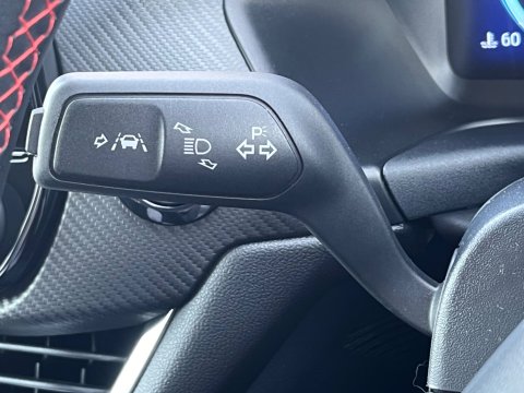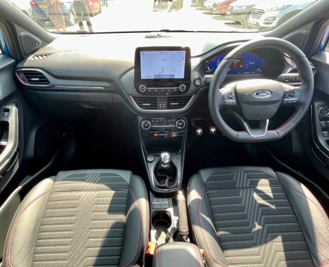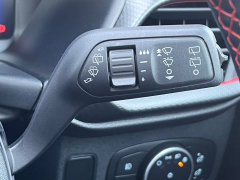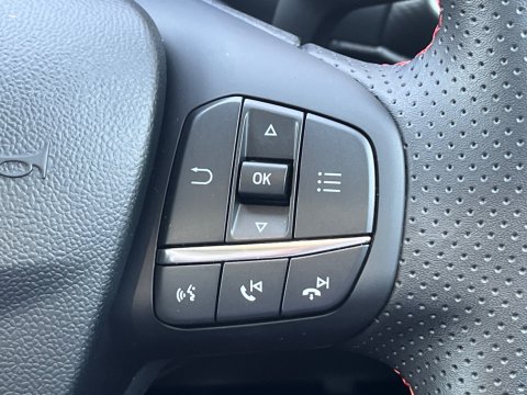 - ST-Line flat-bottomed leather steering wheel with unique red stitching